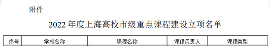 根据上海市教育委员会发布的《上海市教育委员会关于公布2022年度上海高校市级重点课程立项名单的通知》(沪教委高〔2022〕27号),我校7门课程通过市教委评审立项。具体名单如下图(次序以教委公布名单为准):