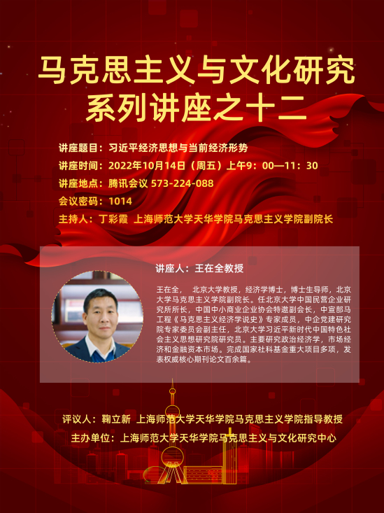 讲座题目:习近平经济思想与当前经济形势讲座时间:2022年10月14日(周五)上午9:00-11:30讲座地点:腾讯会议 573-224-088会议密码:1014
