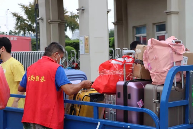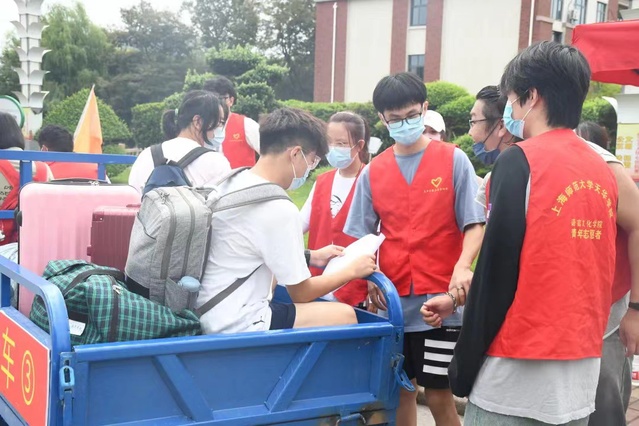 清晨7点志愿者们等候在嘉定西地铁站,引导新生坐接驳车返校,所有新生从东门进入校园报到,新生抵达东门口时,志愿者们积极上前接过行李,学校后勤车队共完成了16895件行李的运输。