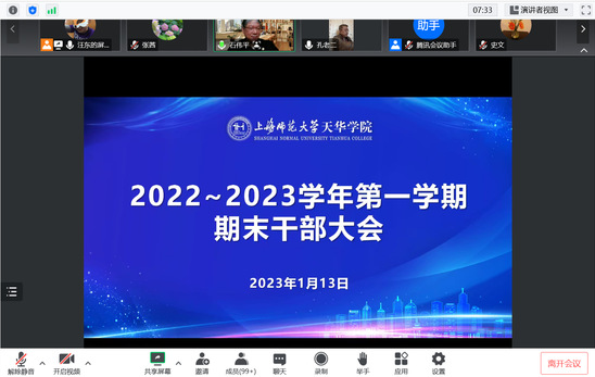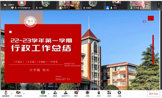 1月13日上午,学校线上召开2022-2023学年第一学期期末干部大会,回顾总结本学期各方面工作的开展思路与有效做法,同时发现短板与不足,谋求学校长足发展。学校执行董事长石伟平、党委书记陆建非、校长叶才福等党政监领导出席会议,全体助理级以上干部参加会议。会议由执行董事长石伟平主持。