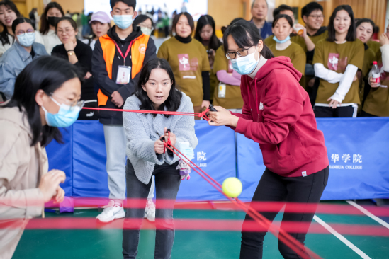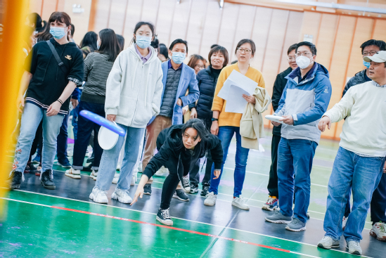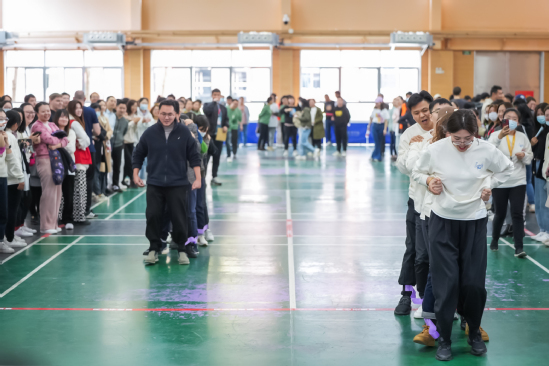 “巨人的脚步”项目中,老师们脚步节奏一致,互相鼓励,同心协力,朝着目标奋力前进;“纵横天下”项目拼速度,拼智力,更拼配合,队员们依次用两根绳子传递小球,直到最后一名队员顺利接到球,并将其放入木桶中;“锁定新目标”项目为九宫格飞盘投掷,参赛队员个个神情专注,将一个个飞盘掷向得分框内;“企鹅漫步”项目看似简单,实则有一定的难度,选手们双手双腿夹着排球,小心翼翼一步一步往前跑,场面热闹激昂,精彩纷呈。