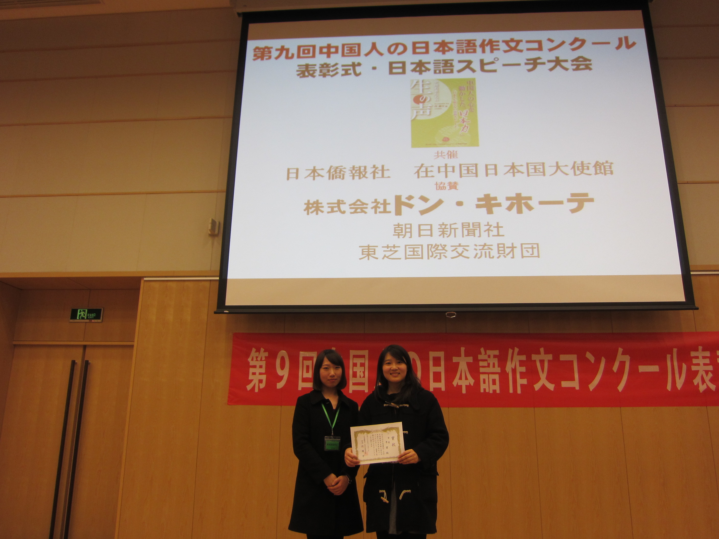 2013年12月12日,语言文化学院日语专业指导老师张丽珺与获奖学生李灵出席了第九回中国人日语作文比赛颁奖仪式,李灵获得了二等奖。(左张丽珺 右李灵)2015-05-21