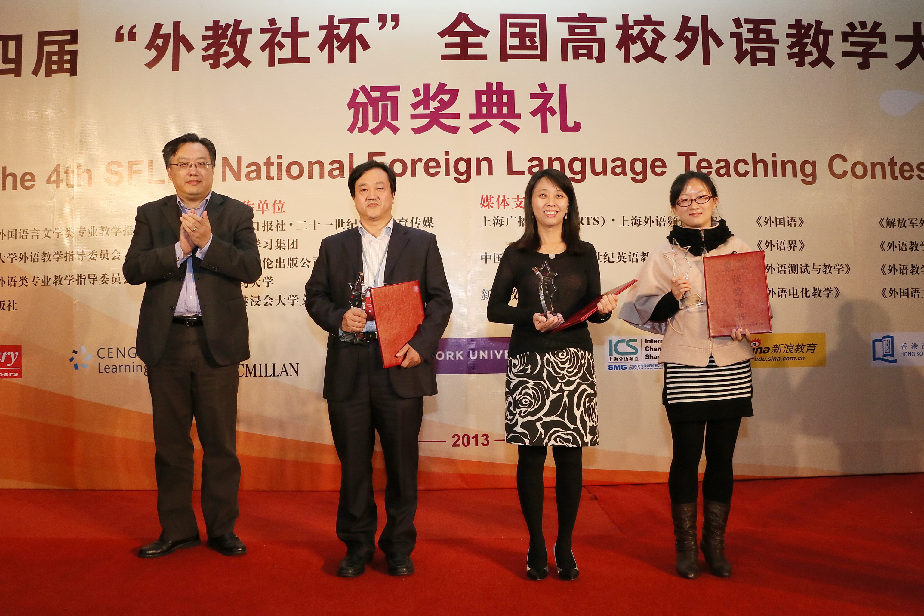 2013年11月12日,第四届“外教社杯”全国高校外语教学大赛电子教案比赛中,语言文化学院胡玥、卜迅、韦晓英、黄蔚四位教师组成的参赛队伍获得了全国一等奖。图为胡玥老师在颁奖典礼现场(右一为胡玥老师)2015-05-21