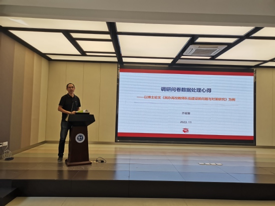 首先,齐砚奎博士以自己的博士论文为例,分享了调研数据定量分析的心得。齐老师分享到,针对民办高校教师队伍建设状况编制调研问卷,对上海市民办高校教师进行随机抽样调查,对调查得到的数据运用主成分分析和因子分析,对影响高校教师稳定与发展的变量进行降维,并结合个体特征进行方差分析;同时,通过回归分析,测量各因子对民办高校教师队伍稳定度、发展满意度影响力的大小;通过聚类分析,对民办高校教师群体进行分类,分别研究其影响因素。齐老师建议学术研究要有学理性、专业性,在数据的收集、整理中,需要加强对理论的运用,在数据分析过程中,方法要运用得当。