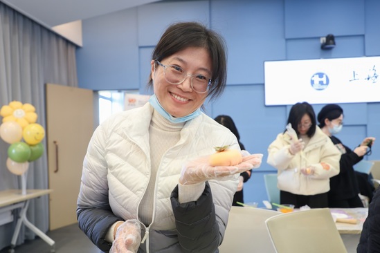 暖场小游戏结束后,“柿柿如意”雪媚娘甜点制作体验正式开始。在指导老师的带领下,教师们将预备好的柿子摘叶去皮,将柿肉捣碎做馅,老师们细心地为柿子剥皮、去叶,将果肉置于碗中,再用勺子将其捣碎。在一片“忙碌”中,柿子清甜的芬芳弥漫于空气,老师们脸上也挂起欢愉的笑容。