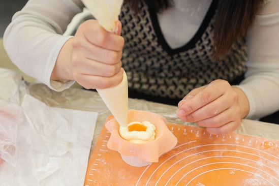 之后进入馅料装填环节,指导老师指出了运用工具塑性的便捷性,并亲自演示在装填馅料时要先铺奶油为底,放入合适的果肉,再覆盖上奶油,最后以折对角的方式收拢面皮,一只饱满的“柿柿如意”雪媚娘便跃然掌上。现场的老师们纷纷效仿,互相帮助,很快就诞生了许多成品,有的小巧玲珑,有的圆润饱满,无一不是老师们在这场丰富多彩的活动中所取得的成果。