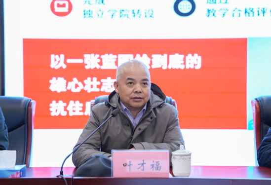 校长叶才福表示要始终胸怀大局,坚持“四个天华”,勇立潮头、锐意进取,扎实推进各项任务,合力锚住完成独立学院转设、通过教学合格评估、争取专业硕士授予单位的三大战略步骤发展目标;倾力稳住事业收入;聚力扭住专业特色、育人文化、国际合作、活力课堂等优势口碑;奋力盯住师资科研实力、毕业竞争能力、智慧校园效力、社会服务动力等提升环节,提升实力,多干实事,使出实招,取得实效,以龙腾虎跃的干劲闯劲与昂扬斗志,充满活力,积极进取,实现天华事业发展新突破。