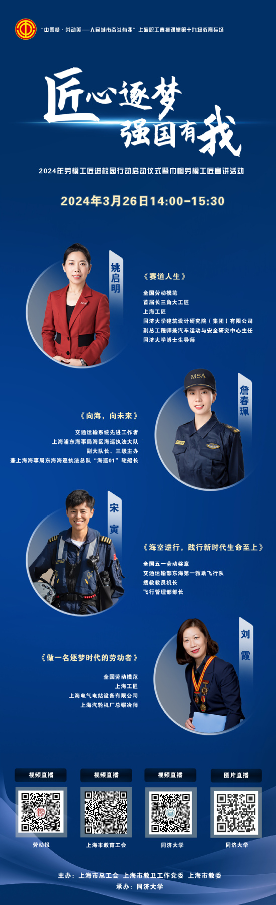 由市总工会、市教卫工作党委、市教委主办、同济大学承办的2024年劳模工匠进校园行动启动仪式暨匠心逐梦 强国有我巾帼劳模工匠宣讲活动将于今天3月26日下午2点进行。届时“中国赛道设计第一人”姚启明、“海上花木兰”詹春珮、“中国第一代女搜救机长”宋寅、“中国第一女焊工”刘霞等劳模工匠将作分享交流。敬请关注、转发、扫码收看。