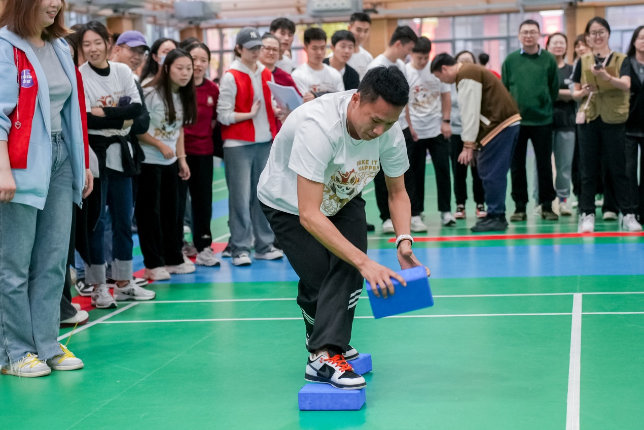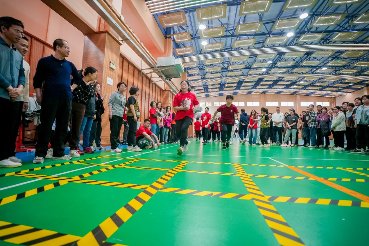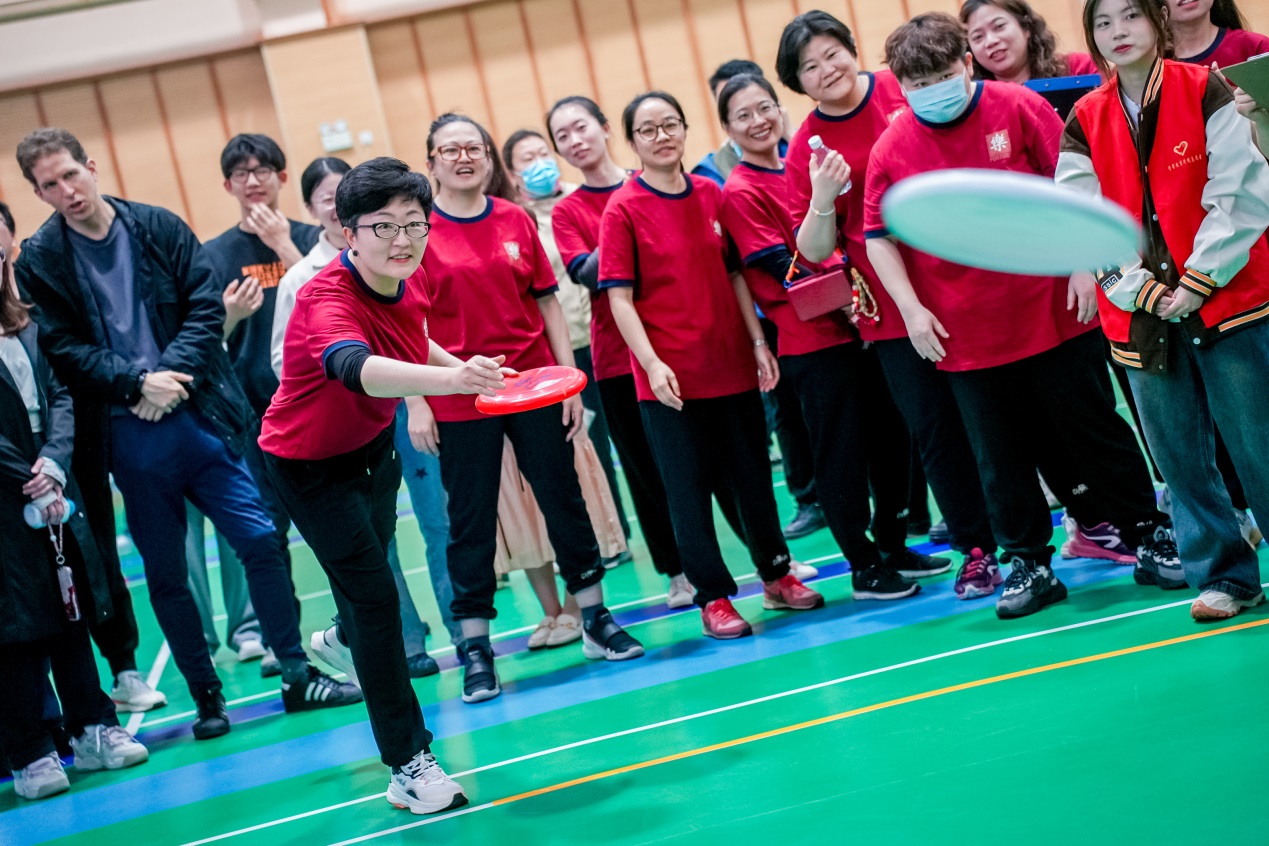 本次运动会项目丰富、内容精彩。在“旱地龙舟”项目比拼中,大家身跨“龙舟”,同心协力,在激昂的口令声中调整步伐,共同向终点线冲刺;“锁定新目标”项目中,教师们聚精会神,手中飞盘在声声喝彩中命中九宫格得分板,为各自的代表队取得精彩成绩;“摸石过河”项目则需要参赛选手使用三块塑胶垫,在手脚不沾地的情况下完成接力,不仅是对体能的考验,也是对身体平衡能力的挑战,教师们纷纷稳踏塑胶板,努力平衡身体,协调四肢、稳中求进;“接力四子棋”则对参赛选手的反应力和速度有着要求,选手需接力跑向一侧放置“布偶棋子”,直至连成四子一线方为成功,在激情昂扬的欢呼与鼓舞下,各代表队也以最佳姿态完成了这一项目的比拼;最后的“纵横天下”项目则一如既往地考验教师们的耐心与专注力,参赛教师全神贯注于手中的两根细绳,不断调试角度与力量,互相配合,将小球以接力运送的形式送入箩筐。