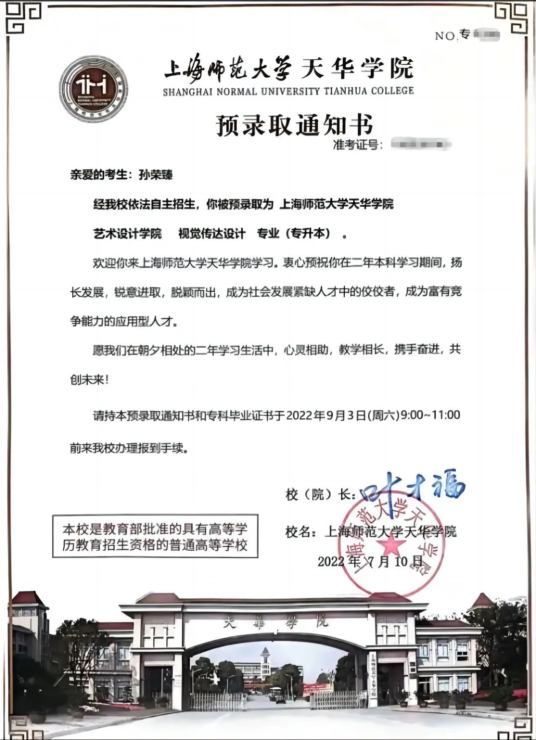 中考时,孙荣臻成功考入上海市工艺美术学校,开启了中职与高职的学习之旅。入学后,她便积极为“专升本”做准备,全心投入到专业学习中。她跟随专业老师认真学习,夜以继日地努力。终于,在专业上她实现了弯道超车,以优异的成绩成功考取专升本,进入上海师范大学天华学院视觉传达专业学习。在天华学院学习期间,孙荣臻凭借出色的学业成绩和综合素质,荣获了2022-2023学年艺术设计学院奖学金,这一荣誉不仅是对她辛勤付出的肯定,更是她不断前行的动力。