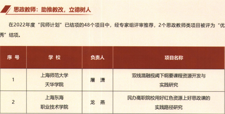 2024年7月,学校9位教师顺利通过第一批2022年立项的上海市民办高校“民师计划”项目结项,其中3位教师被评为“优秀”结项。