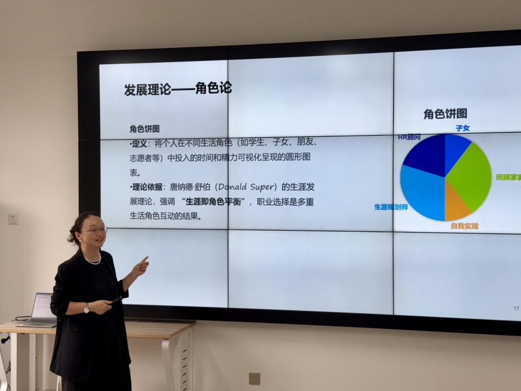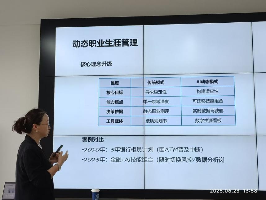 下午的培训由精纳生涯工作室创始人王雅英博士主讲。王博士通过对比2010年银行柜员与2025年护理专业学生的职业发展案例,指出传统职业规划模式已难以适应技术爆炸的时代,提出“可迁移技能+跨界学习能力”的培养新思路。