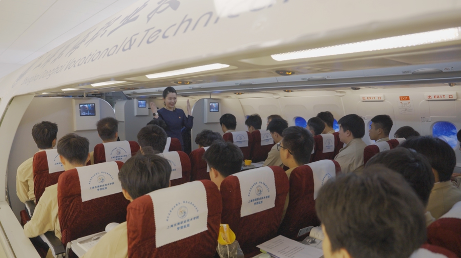 上海东海职业技术学院在模拟机舱上《客舱设备》这一课。