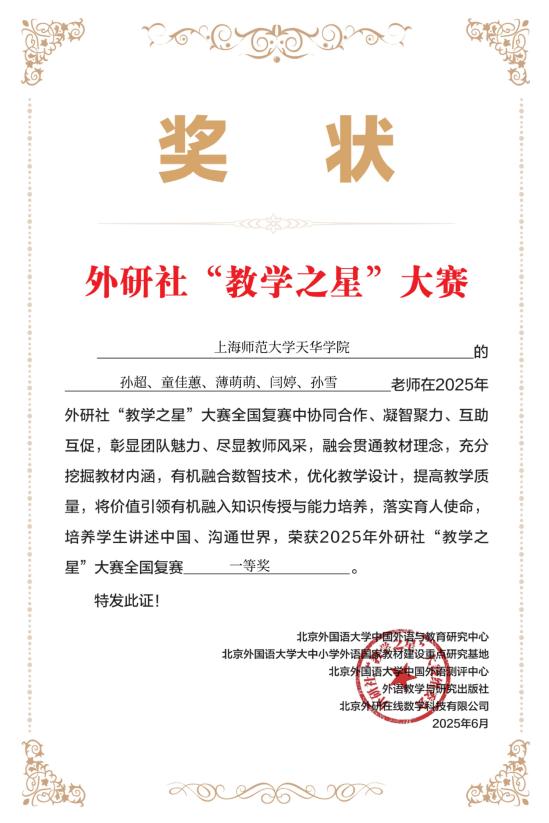 2025年“教学之星”大赛以“理解中国、沟通世界”为主题,吸引了来自全国高校的500余支队伍参赛。语言文化学院由孙超、童佳蕙、薄萌萌、闫婷、孙雪老师组成的教学团队精心筹备,获得了全国复赛一等奖的好成绩!