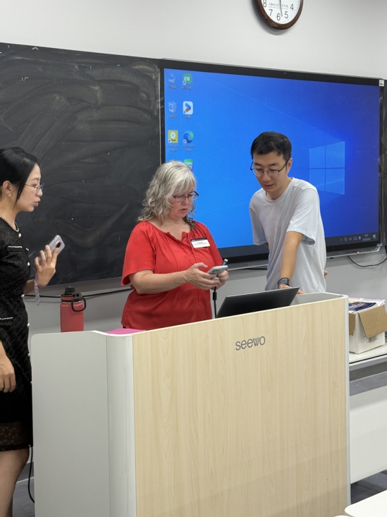 当天下午,助教团队带领外教们到旭华楼、日华楼等多间教室实地参观,现场演示智慧黑板、投影设备、AI辅助教学系统等操作流程,并进行模拟授课演练,保障外教们对教学环境的熟悉度和对教学设备使用的熟练度,以便后续教学顺利开展。