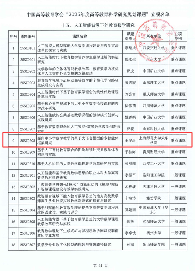 根据《中国高等教育学会关于开展“2025年度高等教育科学研究规划课题”申报工作的通知》要求,我校科研处组织开展申报工作,共上报6个课题,经中国高等教育学会资格审查、匿名评审、公示后,我校获批立项1项重点课题。