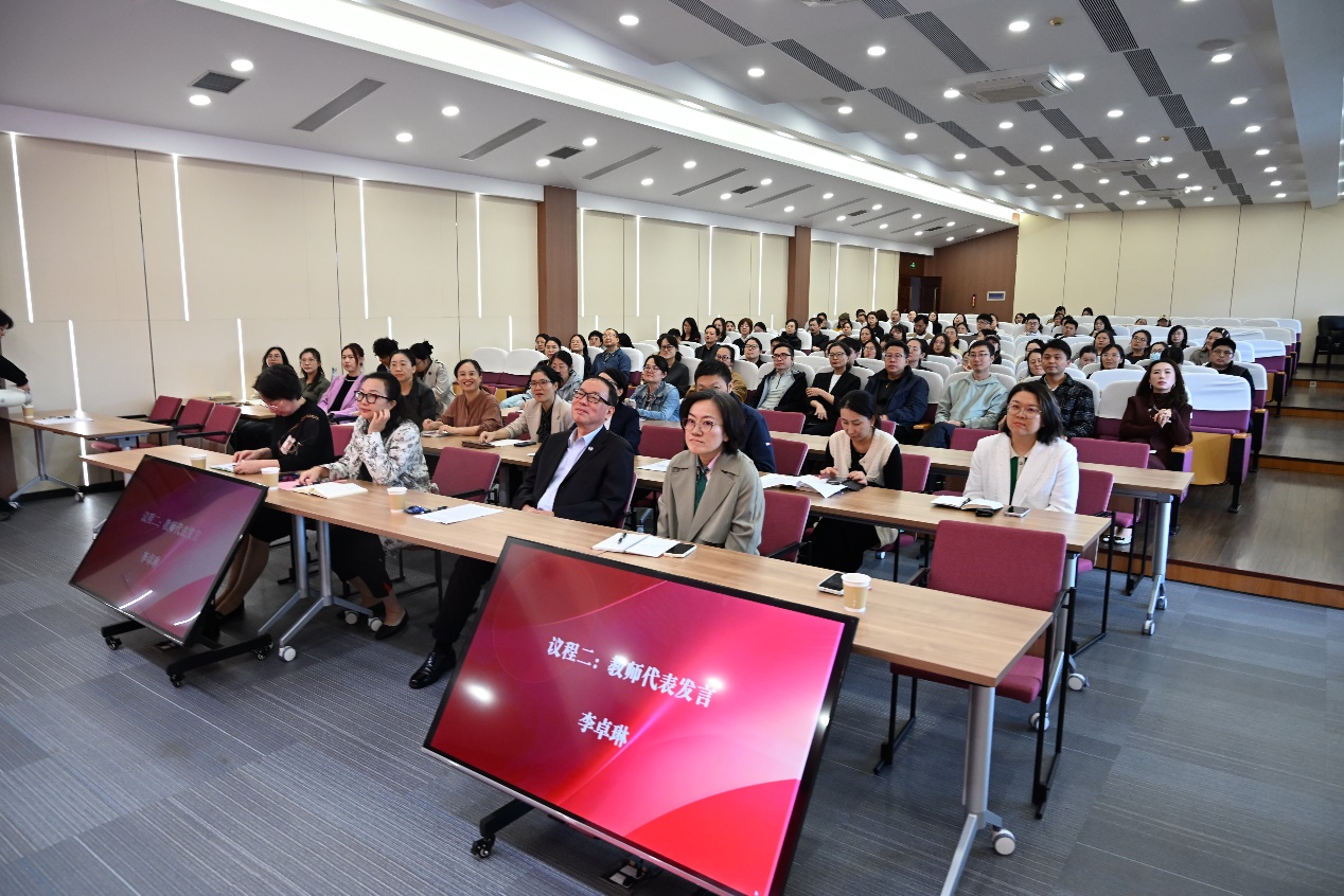 在代表发言环节,获评教师代表、通识学院李卓琳老师分享了自己的成长感悟。她由衷感谢学校搭建的阶梯式培养平台,回顾了自己从预备级到三级,到本轮跳级获评一级名师的历程,感谢学校清晰的晋升机制为教师指明了发展方向。她谈到,教学竞赛与系统培训促使她不断反思与提升,而科教融合的氛围更让她深刻体会到,科研与教学如同“双翼”,相辅相成。她表示,这份荣誉是新征程的起点,未来将努力向学者型教师迈进,与同仁共同成长。