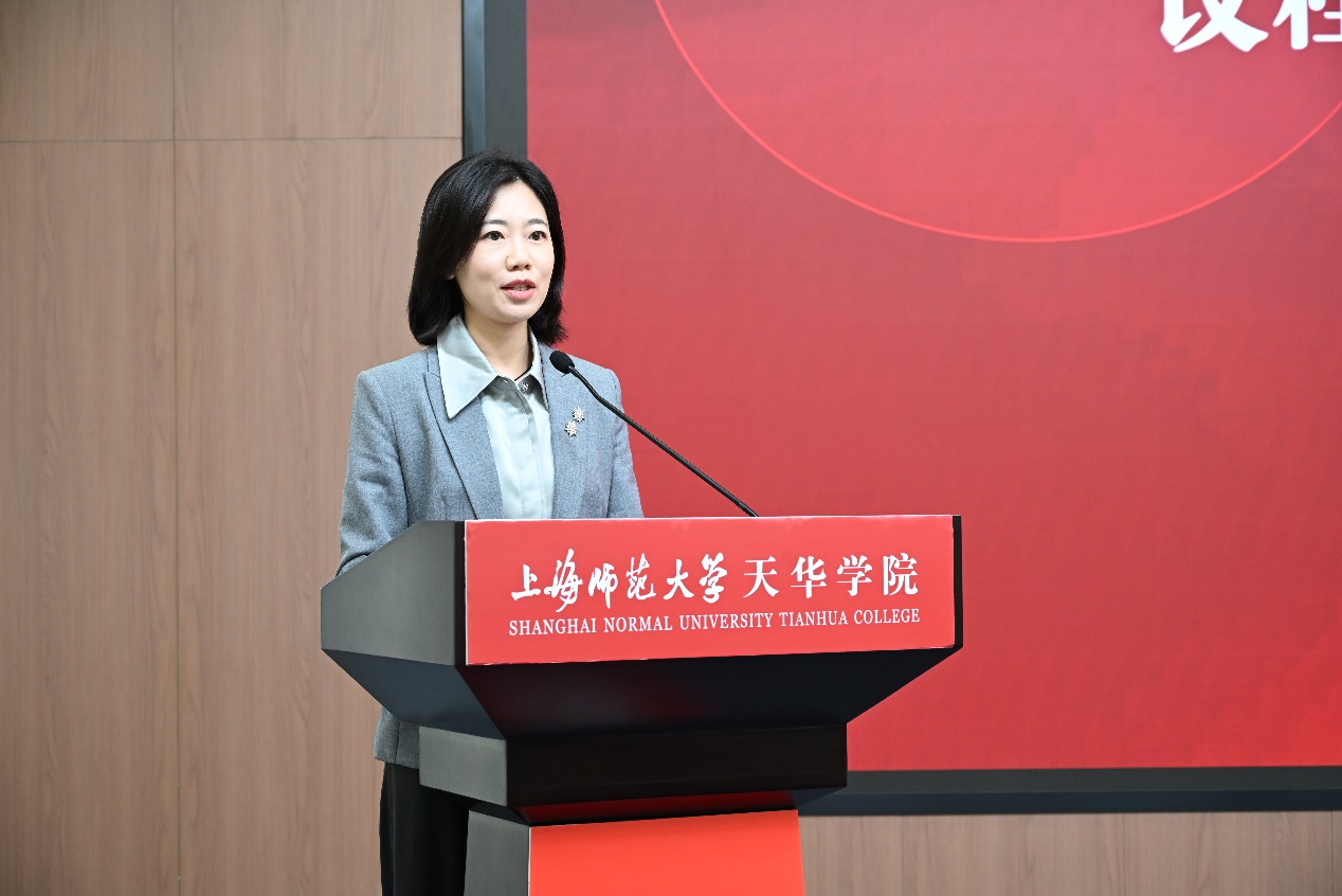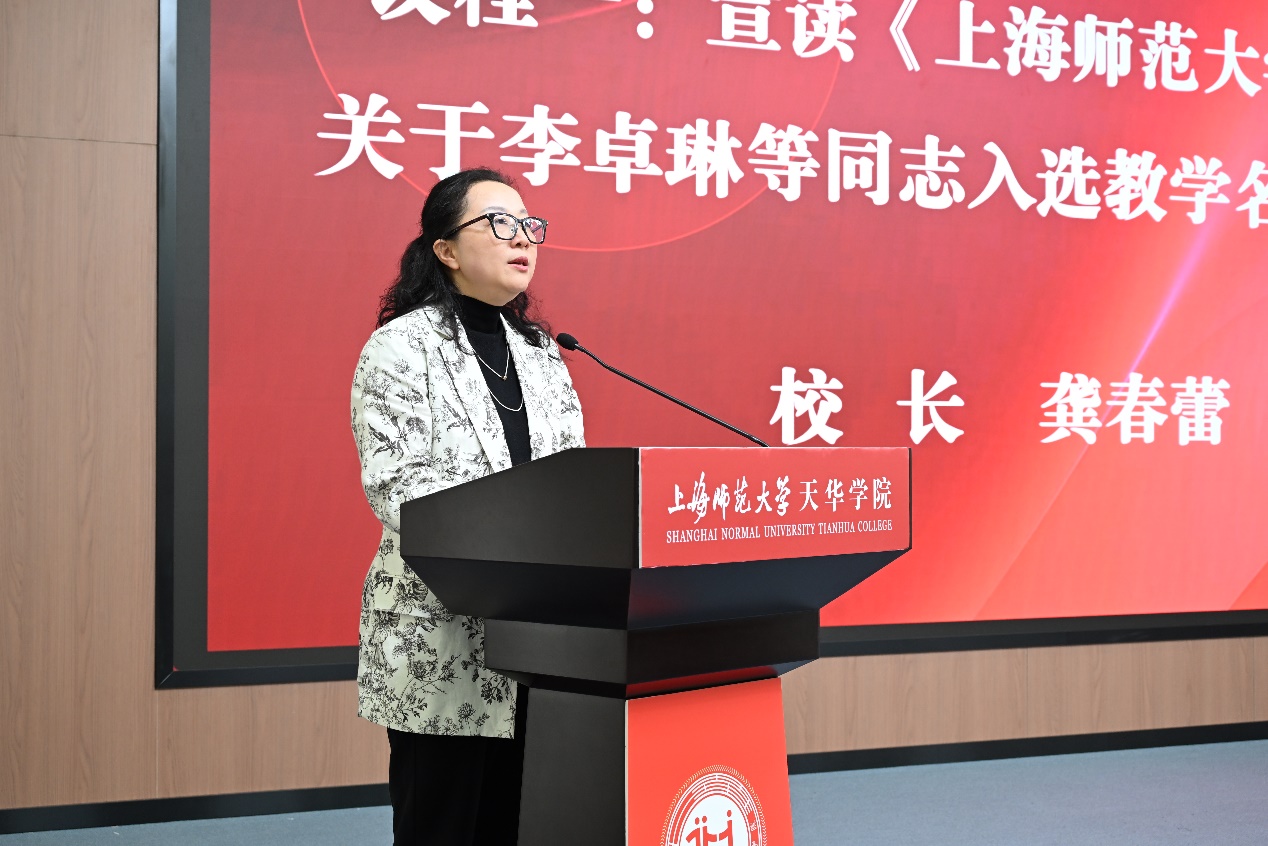 会议伊始,滕薇向获评教学名师的老师们表示衷心祝贺。随后,校长龚春蕾宣读《上海师范大学天华学院关于李卓琳等同志入选教学名师的决定》。本轮评选共产生111名教学名师,其中预备级60名、三级30名、二级20名、一级1名。龚校长邀请每位获评名师起立亮相,全场报以热烈掌声,现场气氛欢愉而温馨。