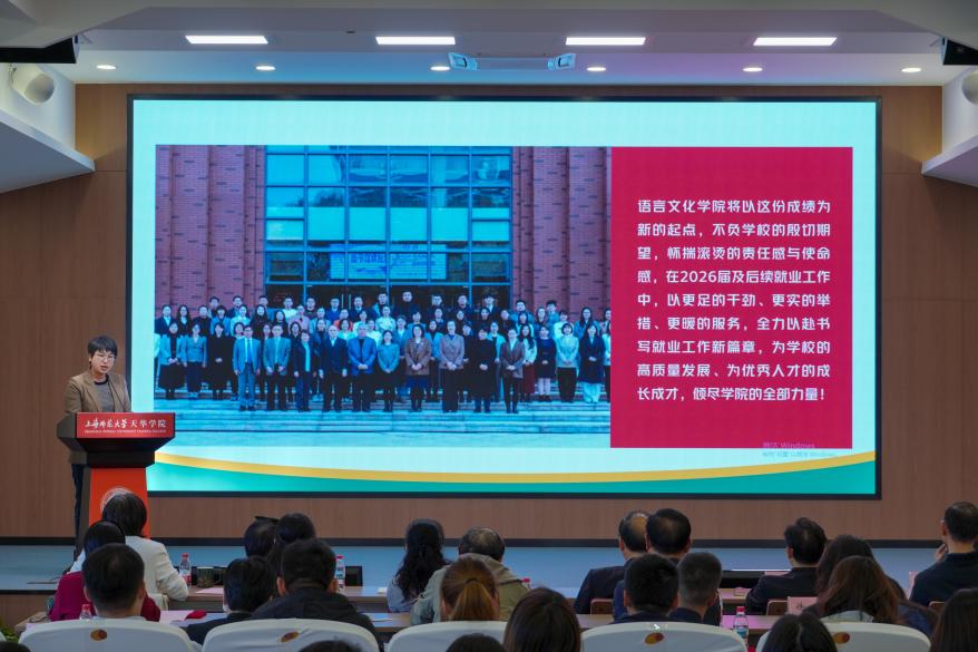 语言文化学院党总支书记郭阿诺围绕“全程服务、精准施策”介绍学院就业工作做法。学院坚持“以生为本”,通过健全联动机制、优化课程体系、拓展实践基地以及强化重点群体帮扶,实现早介入、全覆盖的就业指导路径,不断提升学生职业能力与就业竞争力。