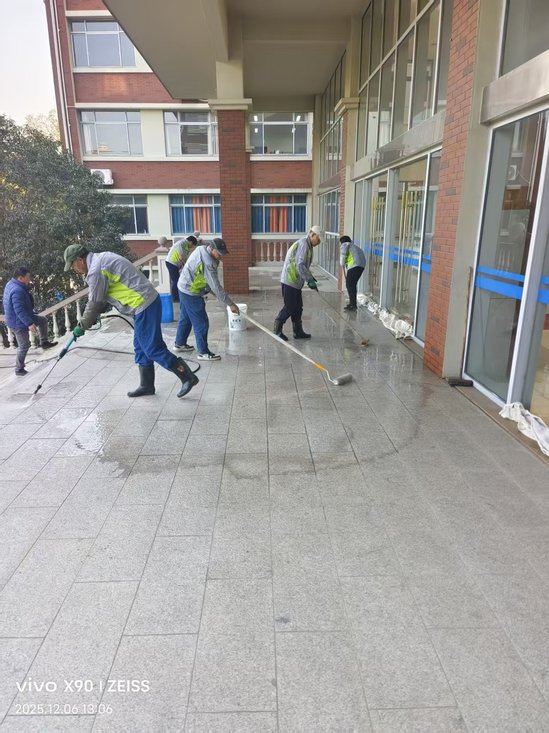 保洁团队:对光华楼、日华楼等主要教学楼及康华楼进行深度清洁,并对教学楼周边公共区域开展系统性清扫,以崭新面貌迎接校庆。