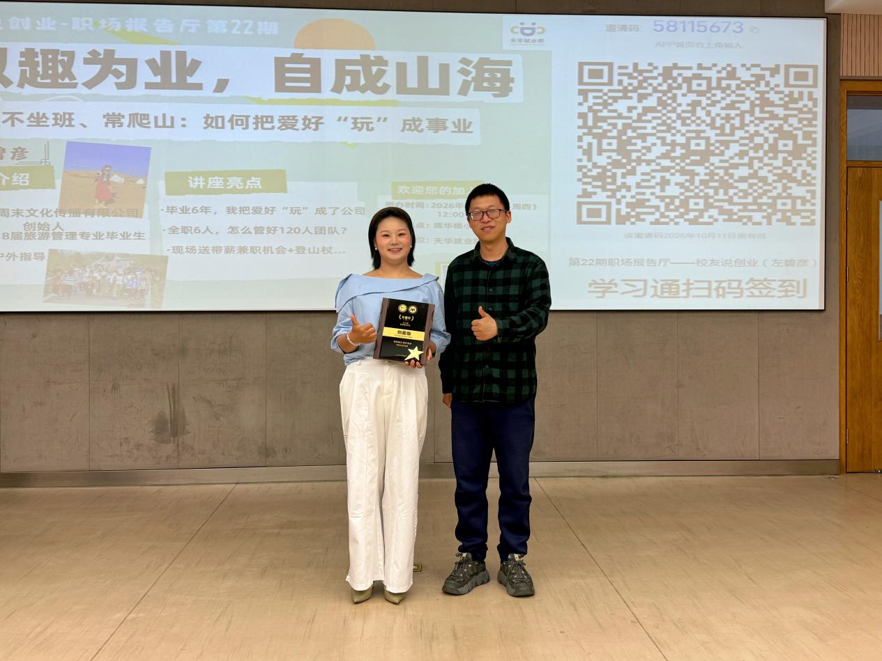 天华就业联盟精准捕捉学子需求,本次主讲人左碧彦(可乐)是2018届商学院旅游管理专业校友、上海悦周末文化传播有限公司创始人,带来“不坐班、常爬山:如何把爱好‘玩’成事业”主题分享。她用毕业6年、横跨4份工作的真实履历,为同学们拆解从“职场牛马”到“户外创业者”的能力积累路径,让每个人都能看到——热爱,可以成为一门踏实的生意。
