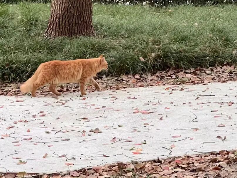 近来的感受是觉得篮球场前到月华楼前的一段路很漂亮,从宿舍往后走,斑驳的石子路铺向小河,再转两个弯,等走到柏油路的时候抬头——蓝天下,两侧的树枝向中间延伸,细碎的光线落在地上,微微泛黄的叶子簌簌作响,而路的尽头,说笑的人群引你向右走,花坛分出了教学楼与图书馆的十字路口,如果这时候转身,大概还能看到篮网稳稳接住了落日。光华楼后向东门大道的一段也同样,那里是猫咪们的“老巢”,如果偶然碰见他们,就能得到如下的两张照片。