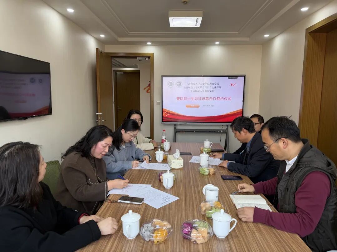2026年1月15日,我校教育学院院长徐娟、语言文化学院院长胡玥、副院长孙超,教育学院院长助理吴彬彬及骨干教师韩笑天一行,赴上海师范大学教育学院参加兼职硕士生导师培养协议签约仪式。上海师范大学教育学院院长黄海涛、副院长阎亚军、初等教育系系主任黄友初等共同出席仪式。