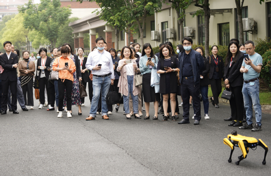 (家长开放日上,家长参观人工智能学院四足机器人)