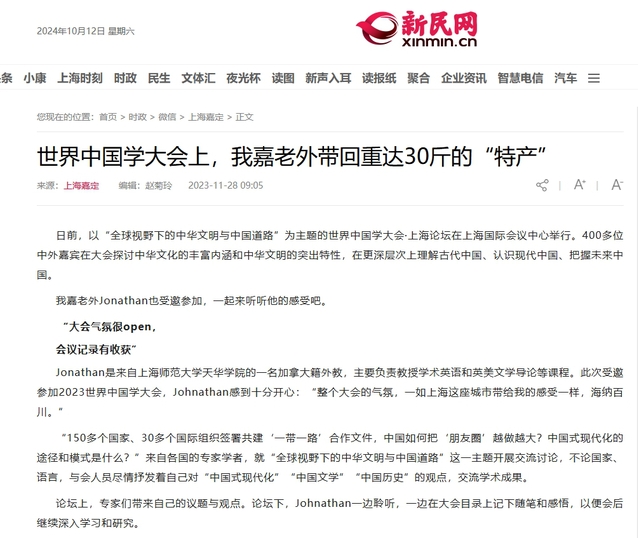 新闻链接:世界中国学大会上,我嘉老外带回重达30斤的“特产”_上海嘉定_新民网 (xinmin.cn)