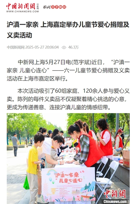 中新网上海5月27日电(范宇斌)近日,“沪滇一家亲 儿童心连心”——六一儿童节爱心捐赠及义卖活动在上海市嘉定区举行。