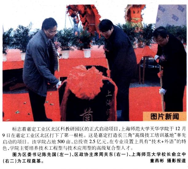 标志着嘉定工业区北区科教研园区的正式启动项目,上海师范大学天华学院于12月9日在嘉定工业区北区打下了第一根桩。这是嘉定打造长三角“高级技工培训基地”率先启动的项目。该学院占地500亩,总投资2.5亿元,在专业设置上具有“技术+外语”的特色,学院主要培养技术工程型与技术应用型的高级复合型人才。