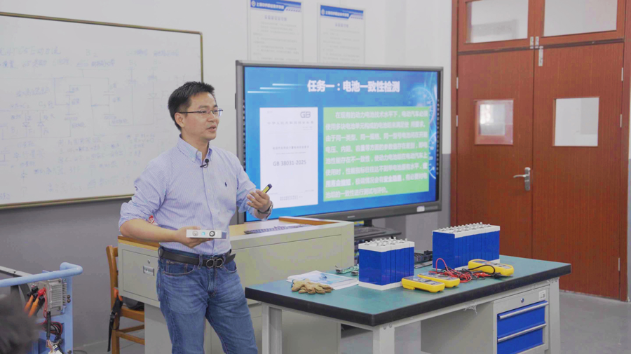 中侨职业技术⼤学《新能源汽⻋技术》的参赛课堂上。