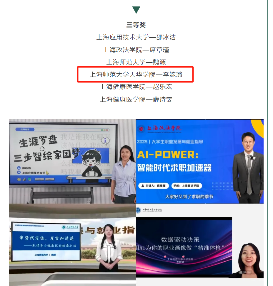 近日,上海市高校第六届就业与创业指导课程微格教学大赛结果正式公布。我校健康学院李婉璐老师凭借课程《数据驱动决策:用AI为你的职业画像做“精准体检”》荣获三等奖。