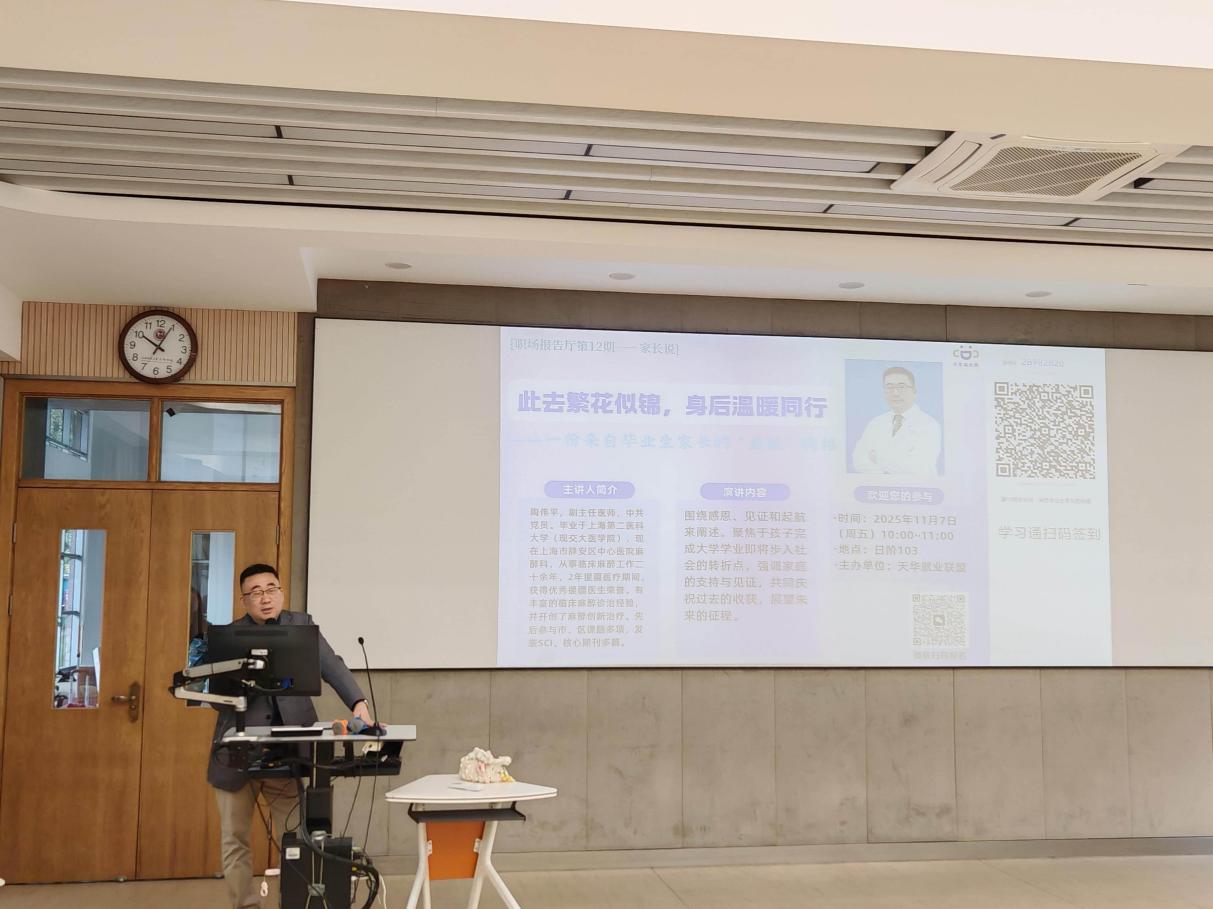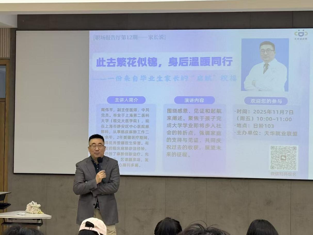 11月7日上午,日阶103教室迎来了一场充满温情与力量的分享——由天华就业联盟主办的“家长说”专场,特邀上海市静安区中心医院麻醉科副主任医师陶伟平,带来题为《此去繁花似锦,身后温暖同行》的“启航”祝福。