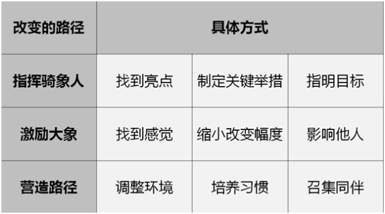 接下来,周琼老师以讲故事的方式带领大家共同“悦读”,同时依托专业心理学知识进行讲解,围绕“大象与骑象人”这一主题,提出要合理分配“大象”与“骑象人”的关系,利用心理学原理激励、改变自我,让改变瞬间而来的9个方法,具体方法如图所示: