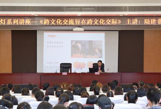 陆教授从“跨语言交流”和“跨文化交际”基本内涵出发,详细解读了跨文化交际的基本理念、基本原则和实践方法,在上海建设全球城市和天华教育国际化的特定背景下,为老师和同学们作了一场精彩、生动的学术报告。陆教授认为文化在全球化大趋势下会越来越体现多元化,每一代人都会为他们生活的时代增添一些新内容,包括吸收新事物、创造新文化;其中,既有纵向的文化继承,也有横向的文化开拓。而最重要的是文化平等观,它是实现跨文化交际的重要前提,因为,文化和语言一样,没有高低贵贱之分,每一种文化的出现和存在都有它的历史必然性和现实合理性,理解、传播、交融是跨文化交际能力的重要因素。