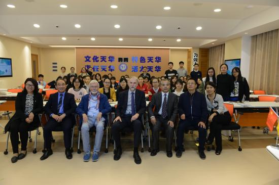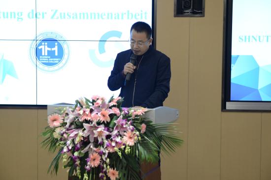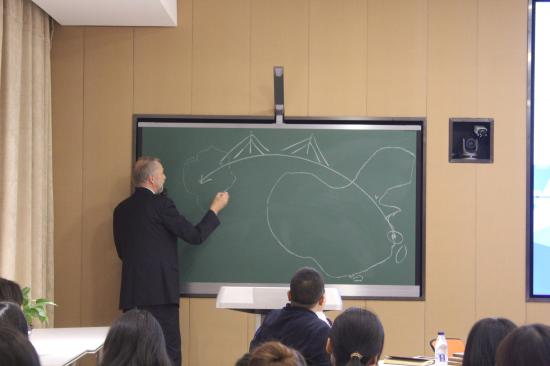接下来,欧福大学雷纳尔图克教授介绍了欧福大学发展概况以及专业学习情况。德方学校已经为赴德学生做好充分准备,以热情、友好、协作的态度欢迎同学们的到来。他相信,丰富的国际办学经验一定能保证提供较好的教学品质。期间,图克教授用生动的绘画,激励同学们在经过三年的专业学习后,能来到德国进一步提升自己的眼界和专业水平,架起中德两国友谊的桥梁。