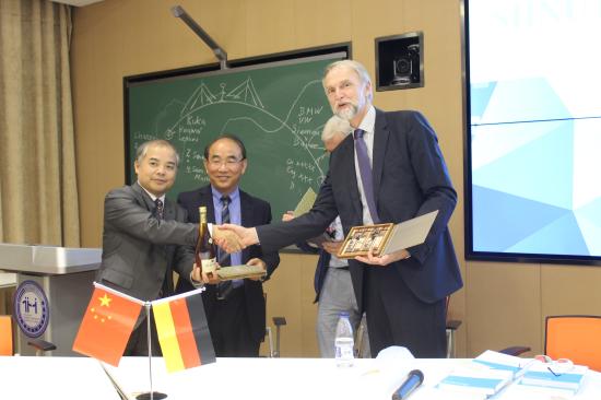 在大会中,语言文化学院史文院长也向外宾表达了热烈的欢迎,他提到自己也十分喜欢德国的文化并希望双方可以进行长期合作,为德语专业师生提供更多优质资源及机会。在开班仪式中,叶才福校长还向雷纳尔图克教授赠送了精心准备富有中国特色的书签,图克校长也回赠了一瓶来找德国的香槟以及由欧福大学编写的论文写作指导书籍,双方互赠礼物后合影留念。
