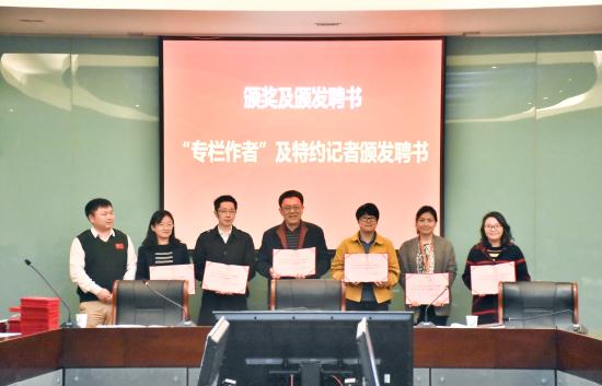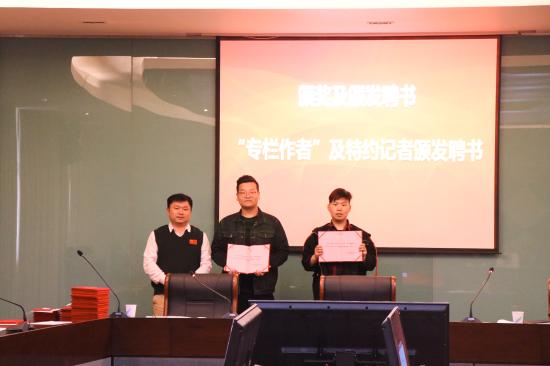 会议第三项议程,由李副部长为“专栏作者”及特约记者颁发聘书;齐砚奎部长为“十佳校园记者”颁发证书;陆建非书记为“新闻工作先进单位”及“先进个人”颁奖证书。