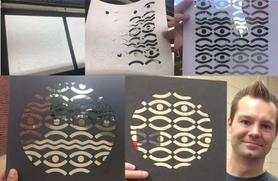 (钟华勇和Franklin在激光工作室雕刻的天华艺术设计学院的logo图案装饰纹样)