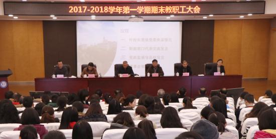 2018年1月19日上午9时许,我校2017-2018学年第一学期期末教职工大会在晖华楼报告厅隆重举行。董事长邹荣祥、执行董事长石伟平、党委书记陆建非、校长叶才福、总校监郭伟奇、原党委书记韩晓玉在主席台就座,校务委员会全体领导以及教职员工出席了会议。会议由执行董事长石伟平主持。