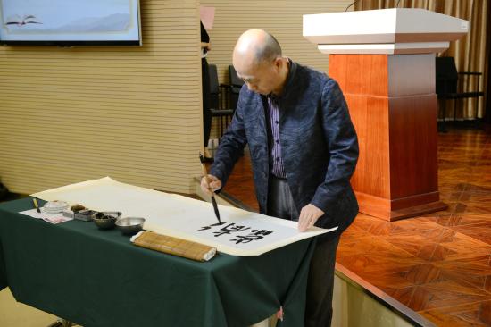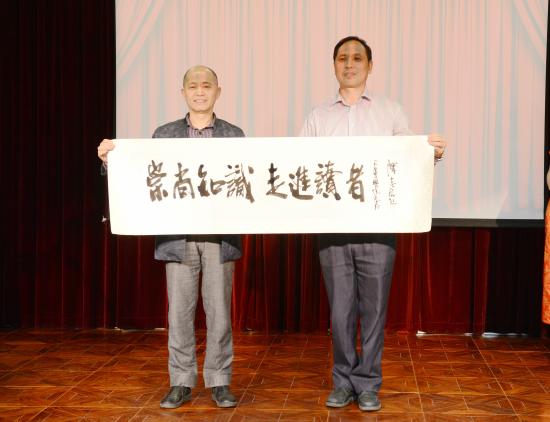著名书画家陈志宏先生现场泼墨,以翰墨之情为天华点赞,写下“崇尚知识、走进读者”赠与天华,朱国权副校长代表学校接收了赠字。