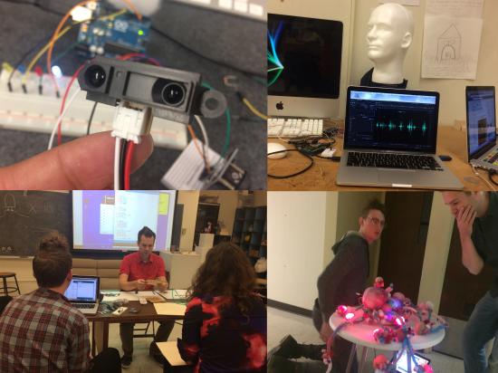Expanded Media课程,是技术和艺术完美结合的课程,课程中Frank Brian教授教会大家设计图形标准,并在雕刻工作室进行二维雕刻和三维打印,完成从概念设计到产品生产的全部过程,并将作品在学院展览馆进行展出。在后半学期,Brian教授更是教大家编写程序,使用微处理器和感应器设计制作一件交互装置作品-这正是人工智能和机器人设计的核心技能。教授要求大家出30个方案草稿,并绘制出来,然后选择其中5个进行全班论证。他并不急于要求大家把创作做成一件可见的或实用的产品,而是希望在创造理念上进行创新和提升,让装置艺术有更多的可能性,他引导大家将话题进行深入讨论,在意识形态上进行挖掘,围绕一个话题甚至可以讨论一节课。