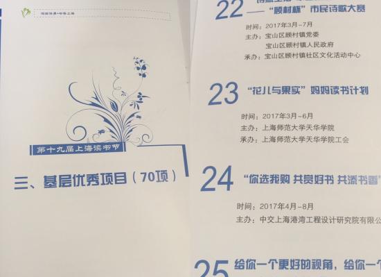 本次读书节是在上海市振兴中华读书指导委员会指导下,由中共上海市委宣传部、上海市总工会、上海市精神文明建设委员会办公室、上海市教育委员会主办,上海开放大学承办,上海市学习型社会建设和终身教育促进委员会办公室、上海市语言文字工作委员会办公室、上海市教育电视台协办的。天华学院申报的“花儿与果实”妈妈读书计划成功入选了本次读书节的“基层优秀项目”。