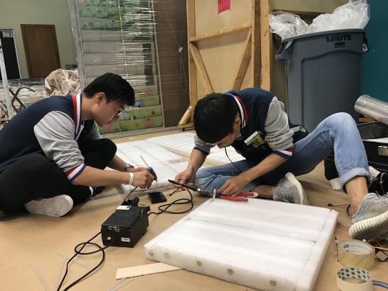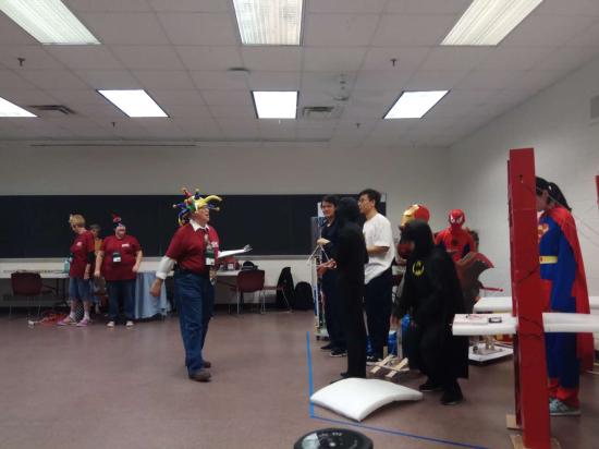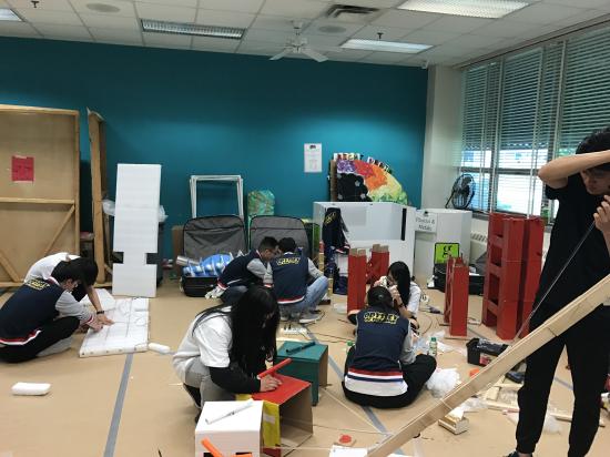 长期题决赛中,我校队员化身为超级英雄,打败了邪恶势力并齐心协力帮助人类修建桥面,通过自制的机械吊车精准地将桥面修复完整,表演结束后赢得了全场观众热烈的掌声。不过在承压结构中没有预期的成绩,由于队员在前一天意外手伤导致在搬运杠铃片无法正常发挥,使得长期题最后的比分不是很理想。
