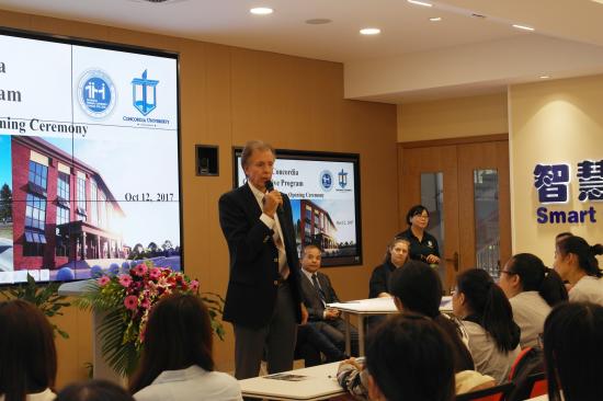 威斯康星协和大学副校长Dr. Cario介绍了威斯康星协和大学发展概况以及专业学习情况,美方学校已经为赴美学生做好充分准备,以热情、友好、协作的态度欢迎同学们的到来。协和国际处主任Dr. Birner详细地介绍了协和大学的国际办学历史,于1965年第一次进入中国,1995年于中国香港办学,现于在上海浦东开办协和国际学校。他们相信,丰富的国际办学经验一定能保证提供较好的教学品质。康复专业主任King博士以亲切、幽默的演讲受到同学们的欢迎。King博士通过提问互动和案例讲解,向同学展示了他在天华美方专业课的课堂教学方法。King博士希望同学们认识到专业所学的知识和将来从事的工作都具备深远的意义和影响,并对同学们的加入表示热烈欢迎。协和亚太地区负责人高老师表示,两校工作人员以真诚、热情、积极的态度,架起了本次合作的桥梁,为同学们提供优质的服务,更希望同学们能够努力打好学业基础,学习好英语,学好中国优秀文化,加强中美文化交流,努力成为第一批有信心、有能力的合作办学的优秀学生。