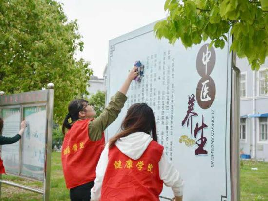 (党员志愿者在擦拭宣传栏)