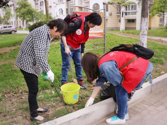 (预备党员和社区居民共同清理草坪)