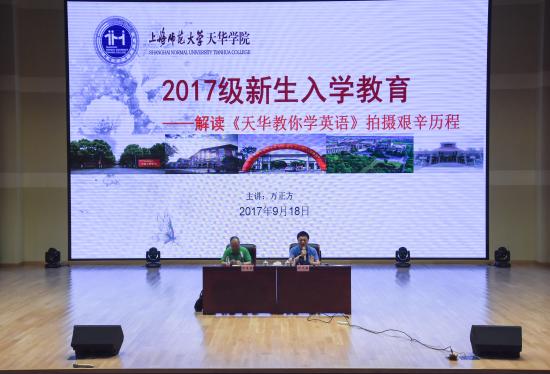 今年是我校《天华教你学英语》的成果年,以语言文化学院万正方教授为首的十五位中青年教师在邹董事长亲自指导和谆谆嘱托下,不计时间、不计报酬、冒着严寒、战着酷暑,前后历经三载春秋,拍摄776集高水平英语视频。今年9月,《天华教你学英语》系列教材由国内高水平的外语教学与研究出版社出版,在2016、2017级学生中投入使用。作为《天华教你学英语》的领军者,年近7旬的万正方教授从天华教育国际化大背景出发,详细解读了拍摄视频的艰辛历程、学校的良苦用心。他介绍了《天华教你学英语》过程拍摄过程中的点点滴滴,在此过程中,涌现出一批舍小家为大家奉献的优秀教师。随后,与在座的新生分享了学习英语的具体方法和学成后对个人和家庭带来的巨大成功和喜悦。万教授提到:虽然拍摄视频历程艰辛,但是想着录好一集集精彩英语视频能让成千上万天华学子广泛受益,心中顿时又充满了力量,义无反顾地坚持下来,为实现天华的教育理想而奋斗。