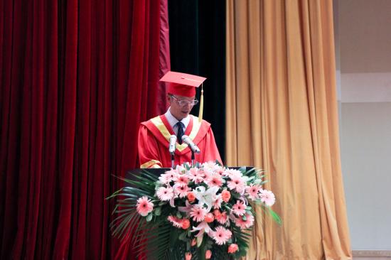 浓浓离别意,深深母校情。来自语言文化学院魏玮作为毕业生代表发言,她也是今年我校34名考上国内外研究生同学的代表。魏玮同学用“坚持”、“奋斗”总结了大学学习和生活,代表全体毕业生表达了对母校的眷恋与感谢、对老师的感激以及对同学情谊的珍惜之情。通识学院聂晓晶老师代表全体教师对同学们的毕业表示了衷心的祝贺,他从其通识教学的大数据统计出发,以“时间”为关键词,追寻大学的梦想,叩问生命意义。聂老师的发言充满深情,博得了一片片掌声。